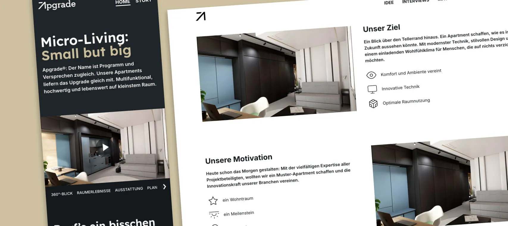 Mit dem Apgrade-Projekt wurde ein neues Wohnkonzept vorgestellt, das kompakte Wohnräume mit hohem Nutzwert verbindet. Die digitale Präsenz sollte dieses Konzept verständlich darstellen und erlebbar machen.