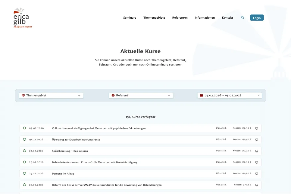 Die erica gilb AKADEMIEN bieten praxisnahe und fachlich orientierte Seminare und Weiterbildungen, vor allem im juristischen Bereich und angrenzenden Themen. Das Angebot richtet sich an Fachkräfte wie Rechtsanwälte, soziale Einrichtungen und weitere Berufsgruppen, die fachliches Wissen für den Berufsalltag suchen.